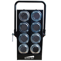 Par 36 bank lights, also known as punch lights, perform as audience blinders and as bang lights in stage shows. Protective metal grill over each lamp. The rear plate features louvers for better ventilation and to prolong lamp life. The heavy duty yoke with positive lock off and t-bar handle allow this unit to be set at any angle. Each bank angle can also be adjusted independently. Suitable for all major brands of color changers. Available in 4 or 8 lamp sets with mounting yoke. Internal wiring (not included) must be completed by user. Four power input cable strain reliefs provided. Use with Par 36 DWE 650 watt lamps or other ACL 28v type lamps sold separately. Body finish in black powder coat paint.